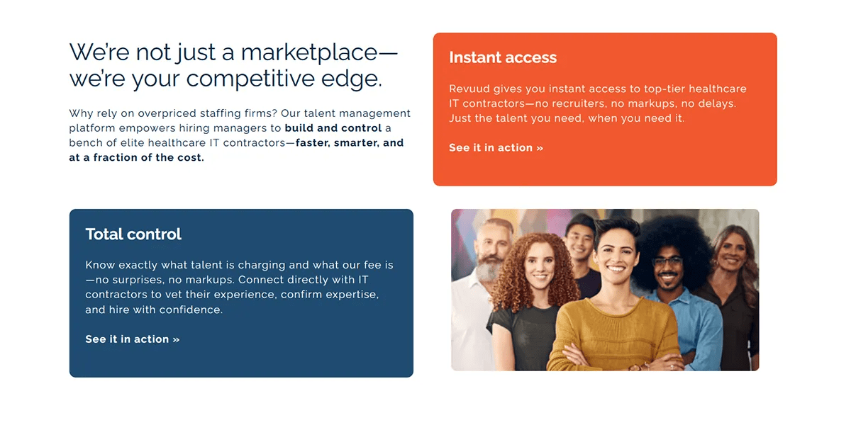 Another cool thing Revuud allows is for health systems to build their own “bench” of trusted IT contractors. Think of it like having your own curated team of experts you can call on whenever a new project comes up. This means you’re never starting from scratch and can quickly deploy talent when needed. It’s like having a team ready to go, without the hassle.